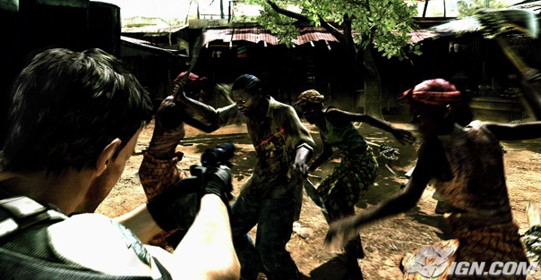 Reader's Note: Let's get one extremely minor, stupid, 'controversial' thing out of the way so that we can both, reviewer and reader, get down to business: Resident Evil 5 features a Caucasian protagonist blowing away lots and lots of non-Caucasian enemies. If you are aware from the outset that the game takes place in Africa and yet you are still troubled by any skin-tone-related aspects—on any level whatsoever—there is a distinct probability that you have been exposed to the brain-damaging mutagenic affliction Politicalus Correctimus. Alternately, there exists the possibility of simple, congenital retardation on your own part. Seek professional consultation before you attempt to breed.HawkZombie Down